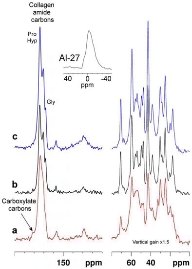 Figure 4. Solid state 13C CP-MAS spectra of untanned hide (a, red dotted trace), and identically acquired spectra of aluminium sulphate tanned leather (b, black trace), and glutaraldehyde tanned leather in which the resolved backbone amide glycyl and prolyl/hydroxyprolyl signals are marked (c, blue trace). The inset is a 27Al Hahn spin echo spectrum of the Al (III) tanned material.