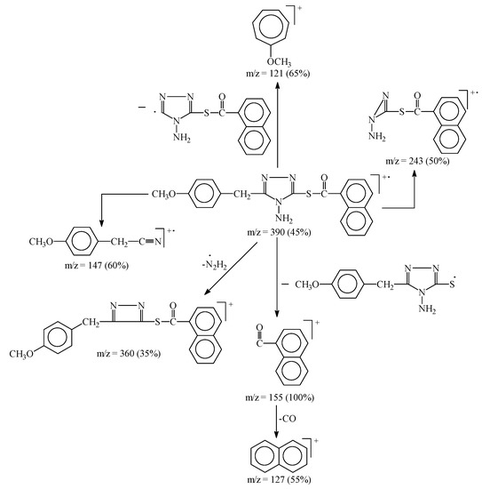 Mass spectral data support the proposed structures. Scheme 2 shows the fragmentation pattern for 5-(4-methoxybenzyl)-4-amino-1,2,4-triazole-2-ylnapthalene-1-carbothioate (6a) which serves as an example for all the compounds mutatis mutandis. The mass spectrum showed various characteristic peaks. A peak at m/z 390 was assigned to the molecular ion. A peak at m/z 155 (the base peak) was due to the naphthoyl fragment and a characteristic peak at m/z 121 was attributed to the tropylium ion produced by the loss of triazole-3-thioester moiety.