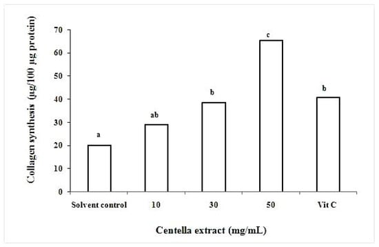 Stimulation of collagen synthesis of fibroblast cells using different concentration of Centella extracts (mg/mL) and vitamin C (25 µg/mL) was used as positive control. Untreated solvent was used as control. All fibroblast were incubated at 5% CO2 for 48 h incubation. Values are the mean ± SD (n = 3). Values with different letter are significant different at P < 0.05.