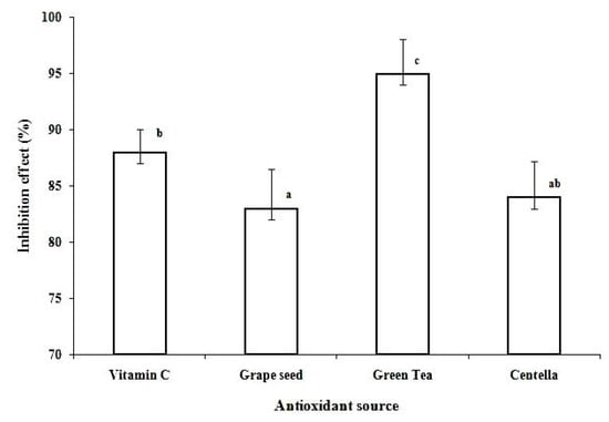 DPPH-radical scavenging activity of centella extract, grape seed, green tea and vitamin C at 1 mg/mL concentrations. Values are the mean ± SD (n = 3). Among the extracts studies, green tea shows the highest inhibition effect followed by vitamin C, Centella and grape seed extract. Values with different letter are significantly different at P < 0.05.