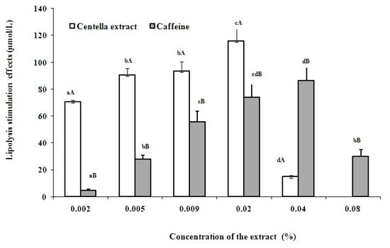 The ability of Centella extract to stimulate lipolysis in adipocytes in a dose dependent manner is shown in Figure 4. The Centella extract has the highest release of glycerol compared to the positive control caffeine at concentration from 0.002% to 0.02%.