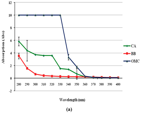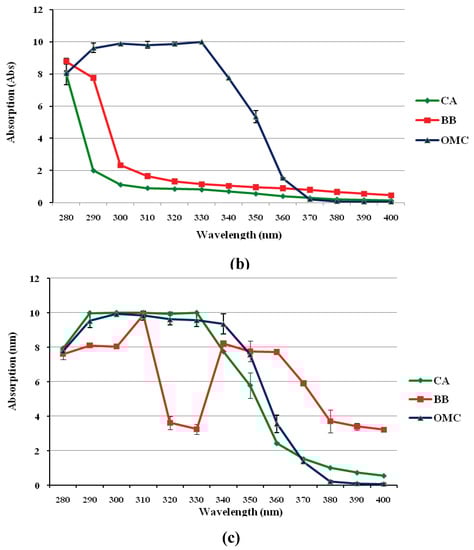 The protection effect of Centella extract (CA), bearberry extract (BB) and octyl methoxy cinnamate (OMC) against UVA (ultraviolet-A) and UVB (ultraviolet-B) damage at different concentration; (a) at 0.1%, (b) at 1.0% and (c) at 10.0%. The 10% Centella extract shows comparable results with OMC.