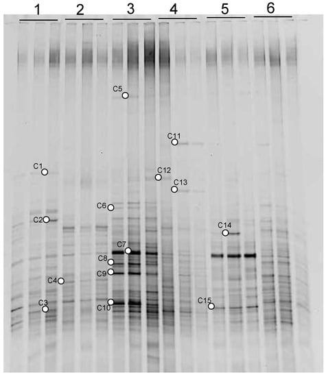 - Muyzer, G.; de Waal, E.C.; Uitterlinden, A.G. Profiling of complex microbial populations by denaturing gradient gel electrophoresis analysis of polymerase chain reaction-amplified genes coding for 16S rRNA. Appl. Environ. Microbiol. 1993, 59, 695–700. [Google Scholar]