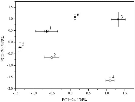PCA analysis of DGGE patterns of 16S rRNA gene fragments amplifyied from DNA extracted form rhizosphere soil under Cu pollution with and without sulfur treatments (1: 0 mg kg-1 Cu+S; 2: 0 mg kg-1 Cu; 3: 300 mg kg-1 Cu+S; 4; 300 mg kg-1 Cu; 5; 1,000 mg kg-1 Cu+S; 6: 1,000 mg kg-1 Cu).