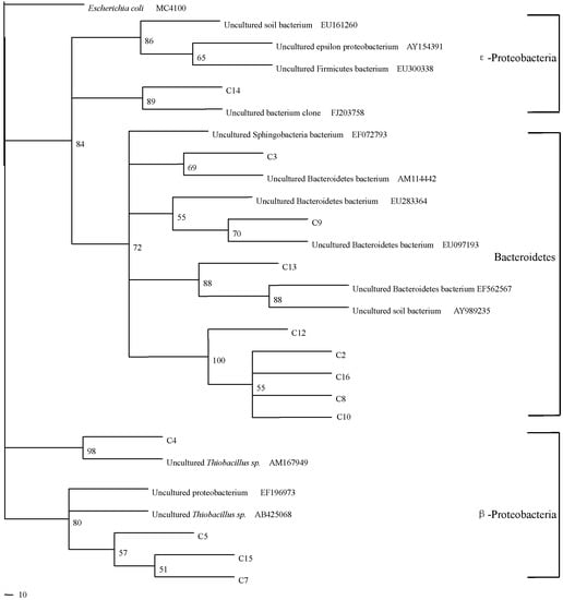 The bacterial community composition was investigated by PCR-DGGE. As shown in Figure 1, a high reproducibility of DGGE profiles was obtained between replicates. Although lots of bands were detected in all samples, there were obvious differences among different treatments. In comparison to samples without sulfur addition, there were some new bands such as bands C7, C8, C9, C10 and C15 in those with sulfur addition (Figure 1).