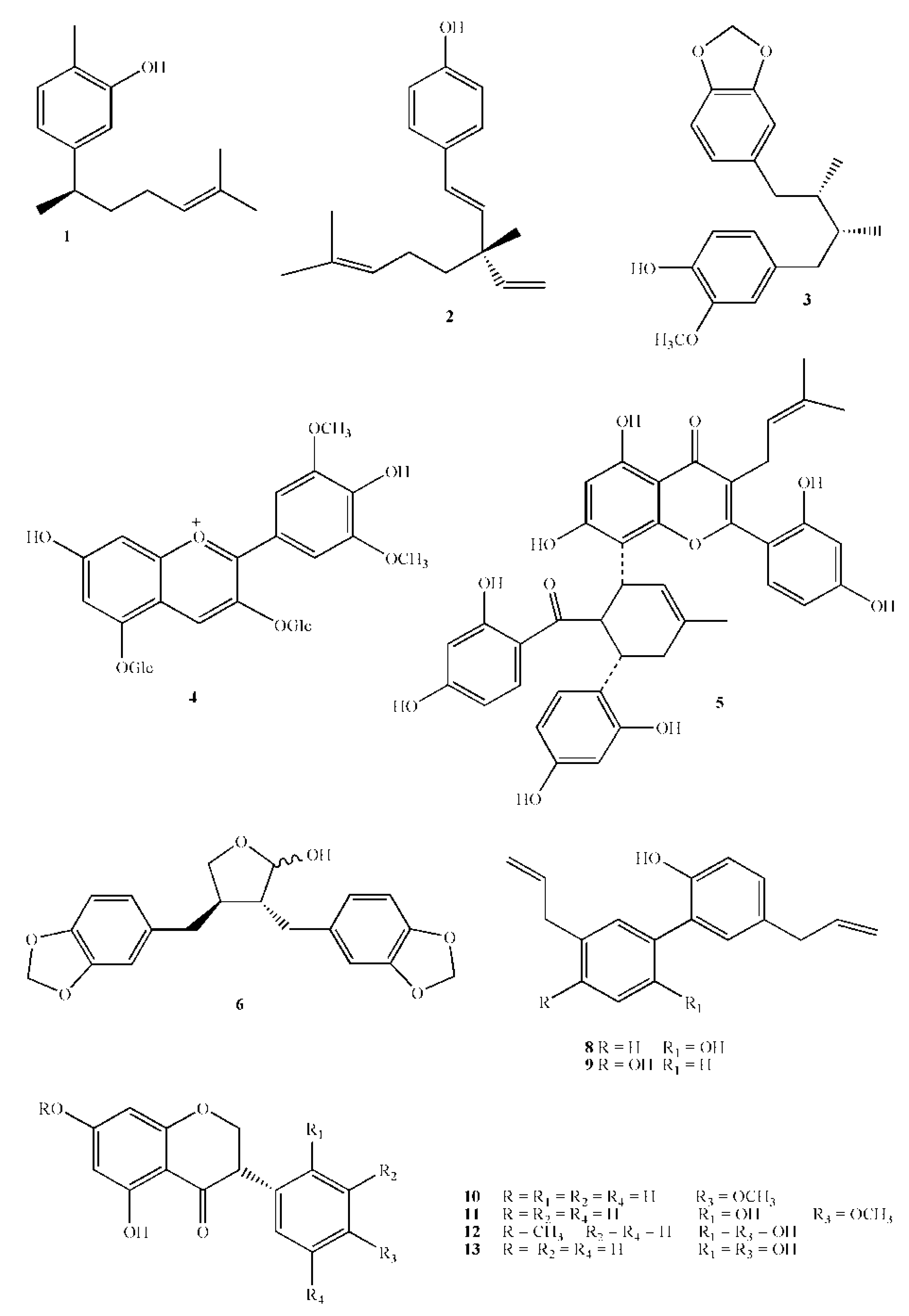 Chemical structures of active polyphenols. 1 Xanthorrhizol; 2 Bakuchiol; 3 Macelignan; 4 Malvin; 5 Kuwanon G; 6 (−)-Cubebin; 8 Magnolol; 9 Honokiol; 10 Dihydrobiochanin A; 11 Ferreirin; 12 Dihydrocajanin; 13 Dalbergioidin.