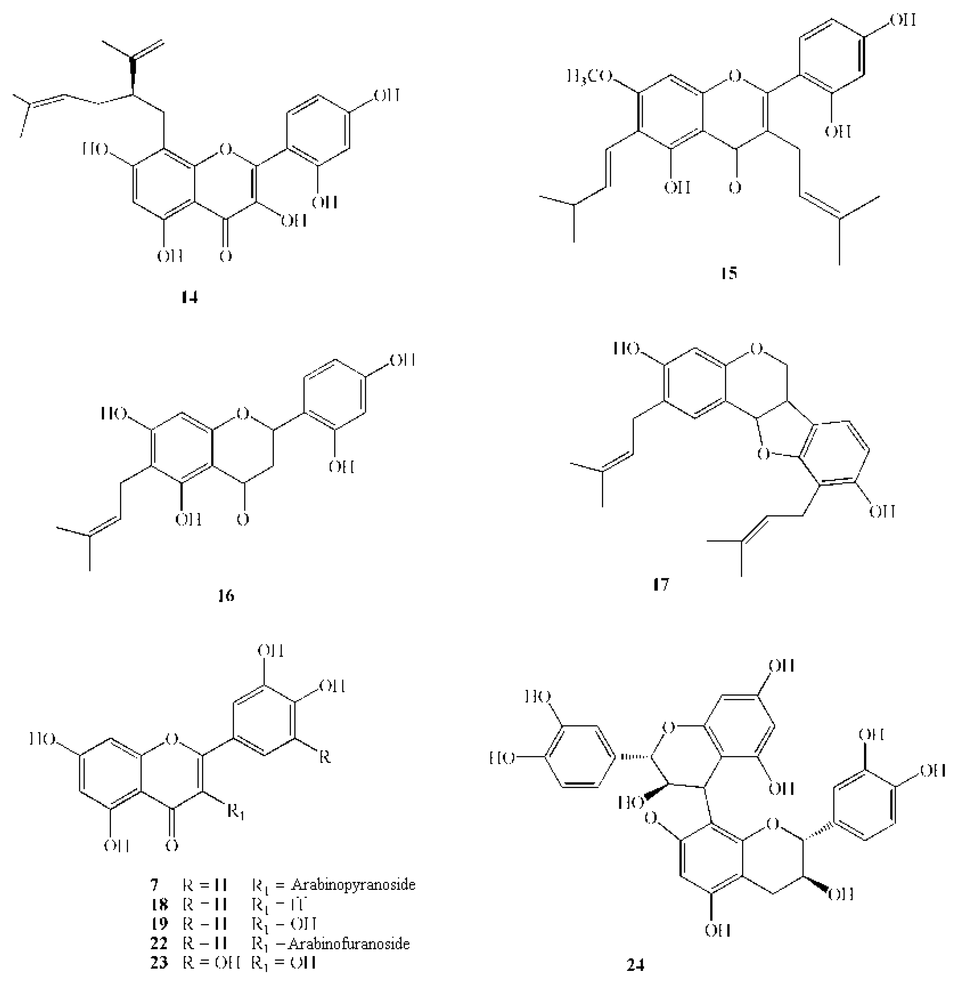 Chemical structures of active polyphenols: 7 Guaijaverin; 14 Lavandulylflavanone; 15 Artocarpin; 16 Artocarpesin; 17 Erycristagallin; 18 Luteolin; 19 Quercetin; 22 Quercetin-3-arabinofuranoside; 23 Myricetin.