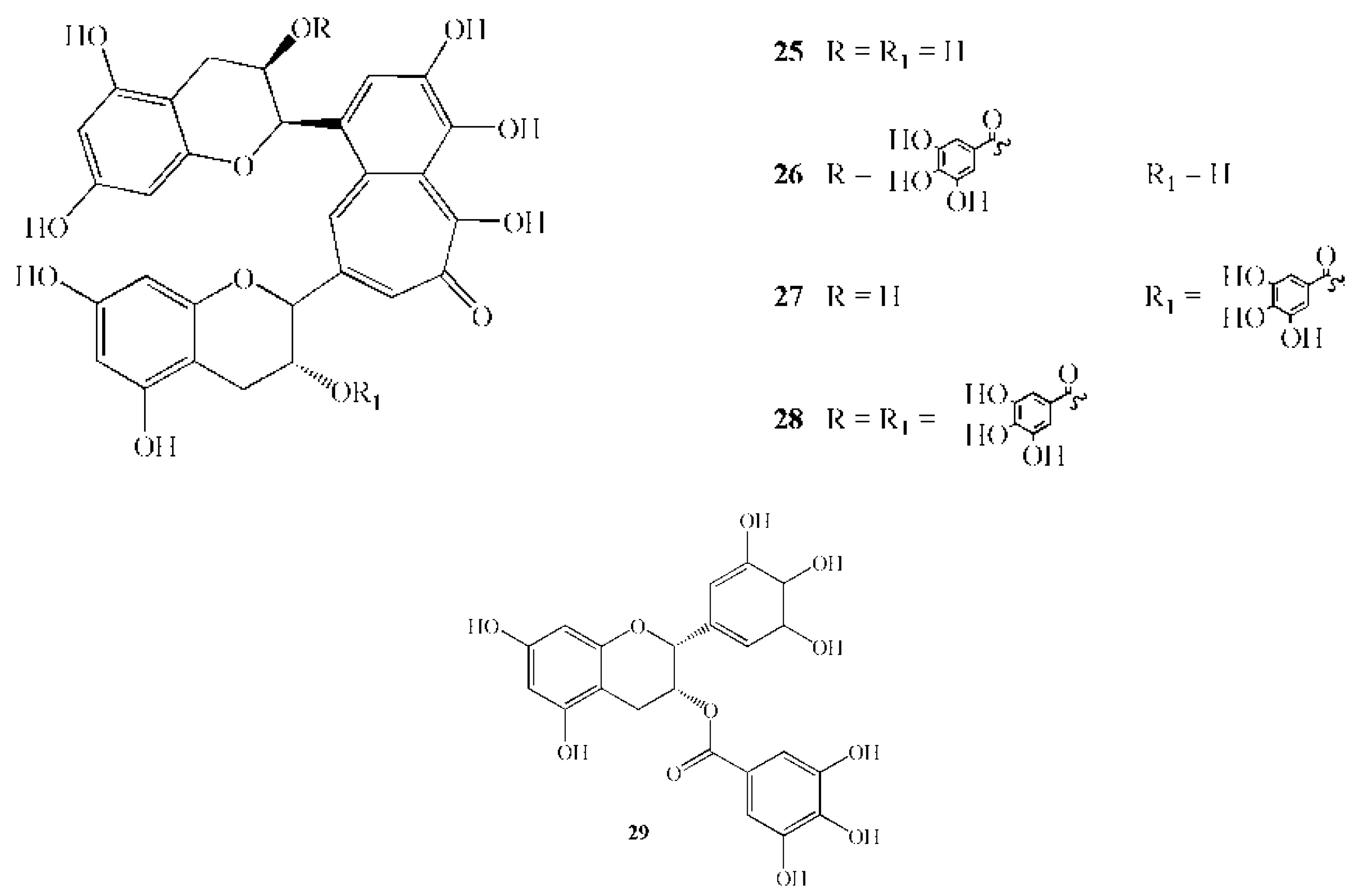Chemical structures of active polyphenols: 25 Theaflavin; 26 Theaphlavin monogallate A; 27 Theaphlavin monogallate B; 28 Theaphlavin digallate; 29 Epigallocathechin gallate.