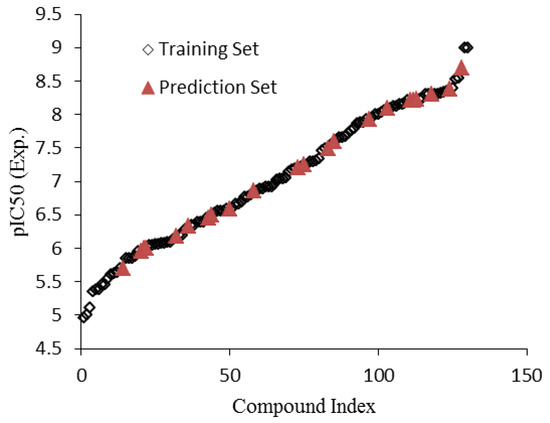 In order to guarantee that training and prediction sets cover the total space occupied by the original data set, it was divided into two parts of training and predication set according to the Kennard-Stones algorithm [24]. The Kennard-Stones algorithm is known as one of the best ways of building training and prediction sets [25,26] and recently, it has been used in many QSAR studies [27,28]. Thus, the training set, which contains 108 compounds with pIC50s in the range of 4.96–9.00 was used for building up the QSAR model, whereas the prediction set containing 22 compounds (out of 130 compounds, i.e., about 20% of the total number of compounds) with pIC50s in the range of 5.70–8.70 was used for evaluation of the model’s predictive ability. The distribution of pIC50 values of 130 essential CXCR2 antagonist receptors are demonstrated in Figure 1. As shown, these pIC50 values cover a wide range from 4.96 to 9.00.