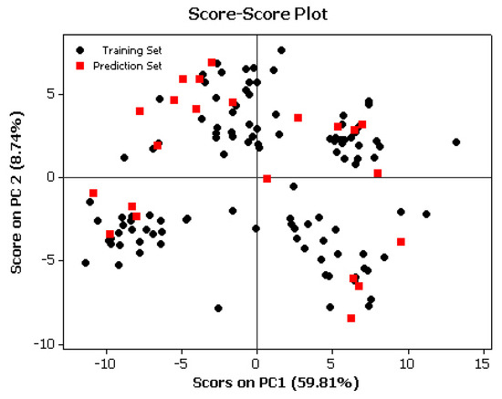 Furthermore, in order to detect the homogeneities in the data set and to recognize the potential outliers in all of the molecules under study, the principal components analysis (PCA) [29] was performed with the calculated structural descriptors on the selected data set. Figure 2 shows that with the two more significant PCs which explain 68.47% of the variation in the data set (59.86% by PC1 and 8.61% by PC2), the distribution of molecules over the region is homogeneous. Thus, the score plot is a reliable representation of the spatial distribution of the points for the data set.