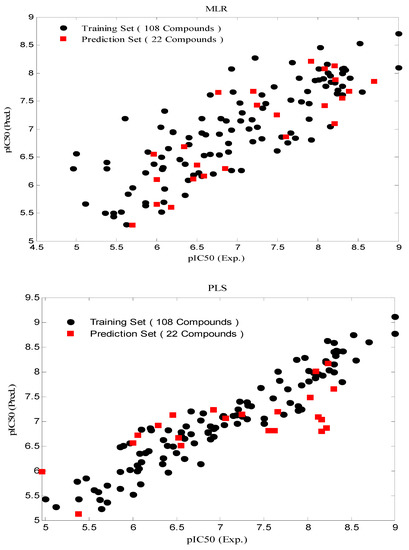 In order to assess the predictive ability and to check the statistical significance of the developed models, the proposed models were applied to predict the values of pIC50 of an external set that was not used in the development of the model. The predictive powers of the developed regression models on the training set were evaluated by predicted values of the prediction set. These parameters are listed in Table 8 and show the good statistical qualities and low precision errors of the assessments.