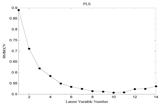 The general purpose of the linear regression method is to quantify the relationship between several independent or predictive variables and a dependent variable. Independent or predictive variables could be various physicochemical descriptors of the molecules, their principle components or latent variables. The partial least squares (PLS) method is used to establish relationships between the dependent variables of the Y matrix and the descriptors of the X matrix (as independent variables also called “latent” variables) [34]. The procedure performs a principle component analysis on the independent variables matrix and simultaneously maximizing the correlation with the dependent variables matrix. The number of appropriate latent variables (LVs) for describing the best developed model was found out by evaluating the root mean square error cross-validation (RMSECV) while the number of latent variables was changed.