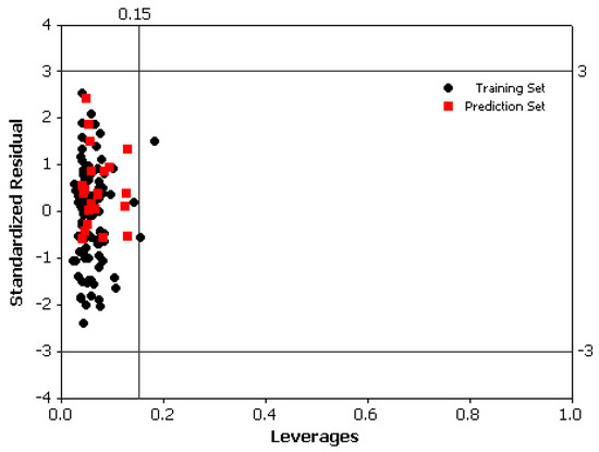 where n is the number of training compounds, p is the number of predictor variables. The defined applicability domain (AD) was then visualized via a Williams plot, the plot of the standardized residuals versus the leverage values (h). A compound with hi > h* seriously influences the regression performance and may be excluded from the applicability domain, but it doesn’t appear to be an outlier because its standardized residual may be small. Moreover, a value of 3 for standardized residuals is commonly used as a cut-off value for accepting predictions, because points that lie within ±3 standardized residual from the mean cover 99% of the normally distributed data [50]. Thus, the leverage and the standardized residual were combined for the characterization of the applicability domain.