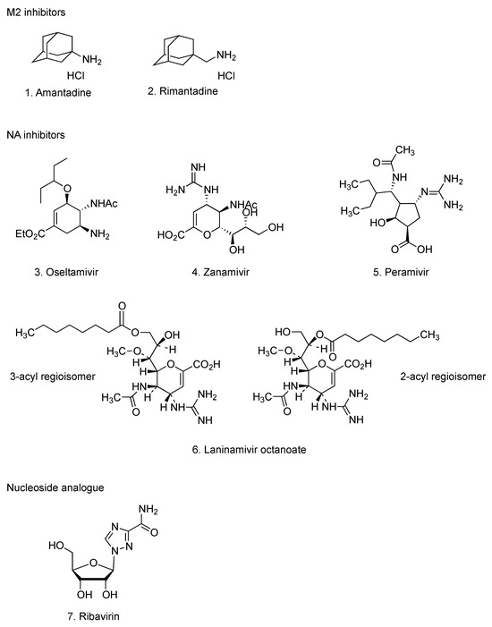 Three classes of anti-influenza drugs have been used for chemoprophylaxis and treatment of influenza virus infections [8] (Figure 1): amantadine (1) and rimantadine (2) which inhibit viral membrane protein (M2) of the proton channel that is necessary for uncoating; oseltamivir (3), zanamivir (4), peramivir (5) and laninamivir octanoate (6) which inhibit viral neuraminidase (NA) that is necessary for virion release and ribavirin (7) that inhibits enzyme activity essential for viral replication. Initial diagnostic testing found that the pandemic influenza A (H1N1) virus was susceptible to NA inhibitors, but resistant to M2 inhibitors [9], therefore, oseltamivir has been used widely for treatment and chemoprophylaxis of pandemic influenza A (H1N1) [2]. Sporadic cases of oseltamivir-resistant pandemic influenza A (H1N1) virus have been reported worldwide [10]. This oseltamivir resistance was caused by the NA mutation H275Y [10]. Person-to-person transmission of oseltamivir-resistant viruses in healthy adults has been confirmed [11]. In cases of development of oseltamivir-resistance, treatment options are limited because zanamivir is not licensed for treatment of children under 7 years old and is contraindicated in persons with underlying airway disease. Recently, it has been reported that a single inhalation of laninamivir octanoate was an effective and well-tolerated drug for the treatment of children with oseltamivir-resistant influenza A (H1N1) virus infection [12]. Additionally, intravenous drip infusion of peramivir has offered a new treatment option for children and infants suffering from influenza virus infections and patients where oral administration was difficult or not possible [13]. It was also effective for severe influenza-associated complications, such as acute respiratory failure [14]. Nonetheless, NA inhibitor-resistant viruses with H275Y mutation emerged early and replicated in patients, who have received hematopoietic cell transplant, under treatment with immunosuppressive drugs after intravenous drip infusion of peramivir [15]. A young adult with pandemic influenza A (H1N1) virus infection was treated with intravenous peramivir, but died from severe viral pneumonia [16]. These results suggest the need for development of new anti-influenza drugs utilizing alternative antiviral mechanisms and consideration of using anti-influenza drug combinations. Some such approaches have been explored, whereby a triple combination of amantadine, ribavirin and oseltamivir was highly active and synergistic against drug resistant influenza virus strains in vitro [17].