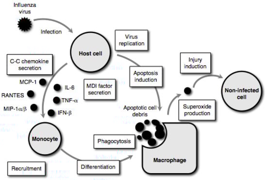 In cases of severe influenza-associated complications, the pathological manifestations are the result of complex biological phenomena, such as apoptosis induction, macrophage activation, oxidative tissue damage and higher contents of pro-inflammatory cytokines [18]. The pathogenesis of severe influenza-associated complications involves not only apoptotic cell death mediated through virus replication in the infected cells, but also the injury of non-infected cells by superoxide anion derived from activated phagocytes (i.e., macrophages and neutrophils) infiltrated into the virus-infected organs [19]. As illustrated in Figure 2 [19], host cells secrete cysteine-cysteine (C-C) chemokines that primarily target monocytes [e.g., monocyte chemoattractant protein (MCP)-1, regulated on activation, normal T cell expressed and secreted (RANTES) and macrophage inflammatory protein (MIP)-1α/β) and monocyte differentiation-inducing (MDI) factor (i.e., interleukin (IL)-6, tumor necrosis factor (TNF)-α and interferon (IFN)-β] in response to influenza virus replication prior to undergoing apoptotic cell degradation. The C-C chemokines act on immature monocytes circulating in the bloodstream, recruiting them to the site of infection. The MDI factor acts on the recruited monocytes, resulting in differentiation into well-matured macrophages capable of phagocytosing and producing superoxide anion. The activated macrophages move to the virus- infected host cell and phagocytose apoptotic cell debris resulting from the viral infection. An abrupt increase in superoxide anion production occurs during phagocytosis. This superoxide anion induces injuries in non-infected cells. These superoxide anion-mediated pathways represent a part of the mechanisms of extensive tissue injury observed during severe influenza-associated complications [20], therefore, it has been suggested that an agent with antiviral and antioxidant activities could be a drug of choice for the treatment of patients with such severe complications [21,22]. This review article updates knowledge of antioxidant therapy as a potential approach to these severe influenza-associated complications.