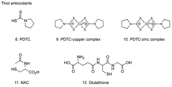 Pyrrolidine dithiocarbamate (PDTC, 8, Figure 3) has been shown to scavenge hydroxyl and superoxide anion radicals; its effect is comparable to that of other free radical scavengers, such as ascorbate and glutathione [29]. Both PDTC and Trolox® (6-hydroxy-2,5,7,8-tetra- methylchroman-2-carboxylic acid; a water-soluble vitamin E analogue) suppressed the accumulation of reactive oxygen species (ROS) in chorion cells caused by influenza virus infection [30,31]. PDTC inhibited both apoptosis induction and virus proliferation in the infected chorion cells, whereas no such inhibitory effect was observed with Trolox® [30,31]. PDTC also inhibited the cytopathic effect of influenza virus infection on the other types of cells, such as human pulmonary epithelial A549 cells and murine macrophage J774.1 cells [32,33,34]. Studies using J774.1 cells also demonstrated that various other antioxidants, such as Trolox®, deferoximine nesyiate, dithiothreitol, N-methyl-D-arginine, catalase and SOD, did not inhibit the cytopathic effects of influenza virus infection [33,34]. These results suggest that the inhibition of influenza virus-induced apoptosis by PDTC is attributable to its antiviral activity rather than its antioxidant properties. That is, ROS may not be responsible for apoptosis induction by influenza virus infection [30,31]. However, as described in the previous section, it has been suggested that organ injury was occurred by ROS derived from phagocytes during influenza virus infection in mouse models. Therefore, these evidence reveals that the pathogenesis of influenza virus infection involves not only the virus replication-mediated apoptotic cell death in the infected cells irrespective of ROS, but also the injury of non-infected cells by ROS derived from macrophages and neutrophils infiltrated into the virus-infected organs. The findings support the notion that an agent with antiviral and antioxidant activities can be a drug of choice for the treatment of patients with severe influenza-associated complications and that PDTC could be one of these drug candidates. Since PDTC is well tolerated in vivo at doses of up to 100 mg/kg (intraperitoneal injection) and exhibits therapeutic effects on animal inflammation and tissue injury models [35,36,37,38], further studies on the therapeutic effect of PDTC on animal influenza models are warranted.