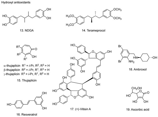 Ambroxol (2-amino-3,5-dibromo-N-[trans-4-hydroxycyclohexyl]benzylamine, 18, Figure 4), known as a mucolytic agent, has been used for the treatment of chronic bronchitis and neonatal respiration distress syndrome [73]. Ambroxol suppressed the proliferation of influenza virus in the mouse airway and improved the survival rate of mice [74]. Antioxidant activity of ambroxol is related to the direct scavenging effect for ROS, such as superoxide anion and hydroxyl radicals [75,76]. Treatment with ambroxol also significantly decreased the incidence of acute upper respiratory diseases during winter season in humans [77].