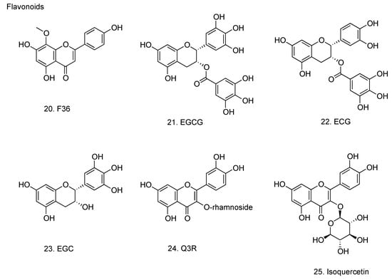 Quercetin 3-rhamnoside (Q3R, 24, Figure 5) from Houttuynia cordata possessed strong antiviral activity against influenza A/WS/33 virus as well as oseltamivir [94]. Pre-exposure of the virus to Q3R did not alter the infectivity. When Q3R was added just after the virus infection or until four hours after the virus infection, the antiviral activity of Q3R was exhibited. Viral mRNA synthesis was inhibited by the treatment with Q3R. The mode of action of Q3R involved the inhibition of virus replication in the initial stage of virus infection by indirect interaction with virus particles.
