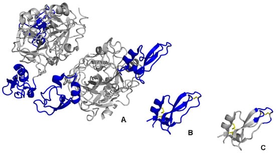 | DX-88 | Kunitz domain | C | α-helix / 2 β-sheets / 3 SS | 58 | 5 + 4 aa / 2 loops | Human (type VI collagen) | Plasma kalikrein | [32,55,56,57] |
