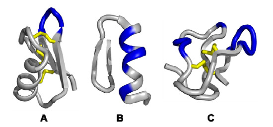 Schematic representations of different scaffold categories. The first type of scaffold displays a single exposed loop embedded in a ridge template (A). The second scaffold class contains a non-contiguous surface region formed by secondary structural elements (B). The third category shows a complex backbone architecture which encloses multiple discontinuous variable loop segments forming a coherent interface (C). Variable sequence regions are coloured in blue, disulfide bridges are coloured in yellow. The schematic representations were generated from the RCSB Protein Data Base: (A): Scorpion charybdotoxin (PDB ID: 2CRD); (B): Single zinc finger DNA-binding domain (PDB ID: 1ZNF); (C): Cellulose binding domain from cellobiohydrolase CeI7A (PDB ID: 1CBH). Structural representations were illustrated using PyMol software [14].