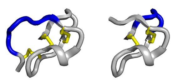 - Heitz, A.; Le-Nguyen, D.; Chiche, L. Min-21 and min-23, the smallest peptides that fold like a cystine-stabilized beta-sheet motif: Design, solution structure, and thermal stability. Biochemistry 1999, 38, 10615–10625. [Google Scholar] [CrossRef]