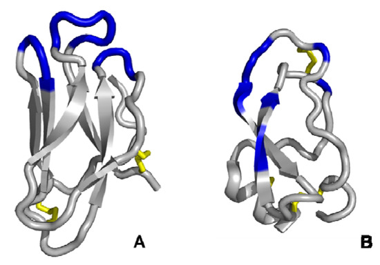 Schematic representations of tendamistat (A) and the Kunitz-domain scaffold (B). The discontinuous surface domains form a coherent interface for the target interaction (coloured in blue, disulfide bridges are coloured in yellow). The structural data (PDB ID: (A): 1OK0; (B): 1AAP) were illustrated using PyMol software [14].