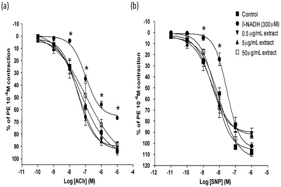 Effect of 0.5 μg/mL, 5 μg/mL and 50 μg/mL P.grandis (stem bark) methanolic extract on (a) ACh and (b) SNP relaxation in rat aortic rings induced oxidative stress by β-NADH. Results are mean ± S.E.M (n = 5–6). Significant difference from control is indicated by * (p < 0.05).