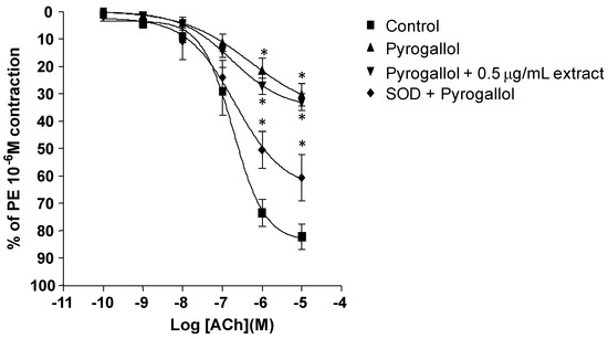In the presence of SOD and β-NADH, ACh-induced relaxation was significantly improved compared with the group with β-NADH alone. The improvement in ACh relaxation was similar to those observed with 0.5 μg/mL extract (Figure 3a). ACh- induced relaxation was impaired in the presence of 10 μM pyrogallol with maximal relaxation at 10−6 M ACh 30.33% compared to control 93.36%. The pEC50 of ACh-induced relaxation in the presence of pyrogallol was not significantly altered compared to the control (−6.30 ± 0.68 vs −7.18 ± 0.13, respectively). Preincubation of 0.5 μg/mL extract did not alter the impaired relaxation caused with pyrogallol (pEC50, −6.76 ± 0.23). However, pre-incubation of the aorta with SOD, markedly reduced the inhibitory effects of pyrogallol on the ACh-induced relaxation of the aorta (pEC50, −6.67 ± 0.34) (Figure 4).