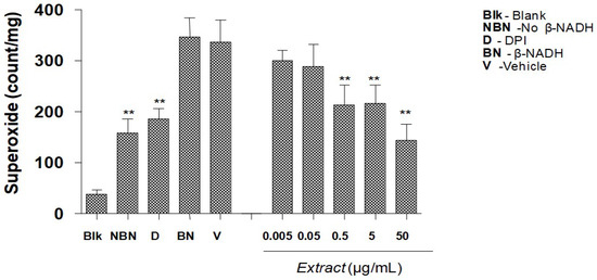 Effect of various concentration of P.grandis (stem bark) methanolic extract onsuperoxide production induced by β-NADH in rat aortic rings detected by chemilunescenceassay. Results are mean ± S.E.M (n = 5–7). Significant difference from vehicle control is indicated by ** (p < 0.01).