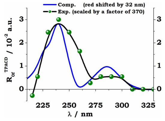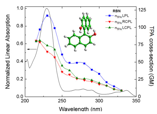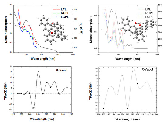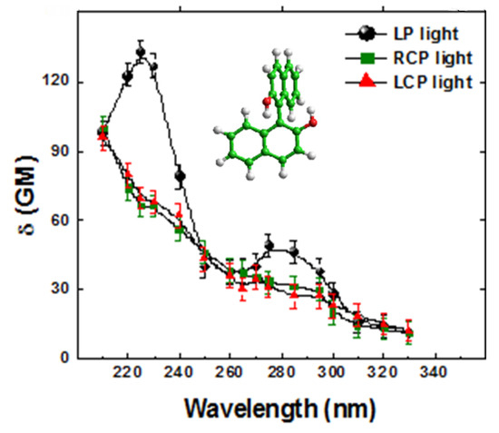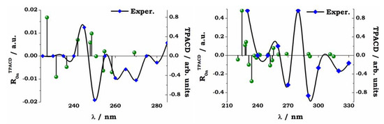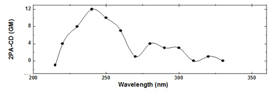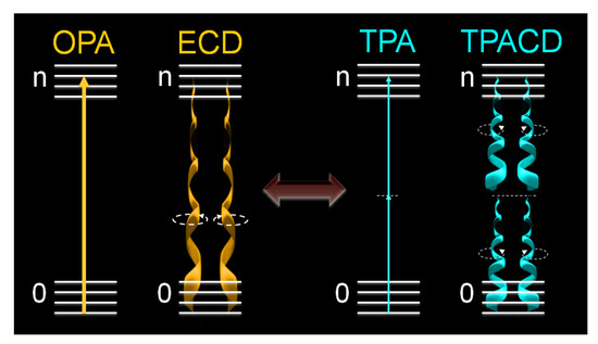 , where δLTPA(λ) and δRTPA(λ) are the TPA cross-sections, δTPA(λ), for left and right circularly polarized light, respectively (Figure 1). Because at typical TPA excitation wavelengths the linear absorption is negligible and scattering minimized, the study of short wavelengths absorbing molecules becomes advantageous [38,39]. In addition, the fact that TPA transitions obey different selection rules than OPA (even-parity vs. odd-parity) leads to think that in chiral molecules ECD and TPACD should present different spectral features. Of course, these rules are very strict only in centrosymmetric molecules. As a result, one should expect greater differences in optically active compounds with a center of symmetry, which is contradictory. Nevertheless, it has already been predicted theoretically that in molecules that do not satisfy this condition, such as chiral molecules, significant differences between the ECD and TPACD spectra can be observed [31]. Therefore, being able to measure TPACD in chiral compounds whose excitation energies are in the UV, would provide structural and conformational information that is complementary to that obtained using ECD.
