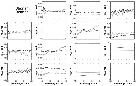First we measured the linear birefringence of the empty CLM with the two-modulator generalized ellipsometer (2-MGE, see the Experimental section), because a commercial CD spectrometer cannot measure the linear birefringence. Figure 1 shows the experimentally normalized Mueller matrices of CLM cell. CLM cell had only linear birefringence and, as a result, m23 and m32, contributed mostly by LB, and m13 and m31, contributed by LB’, were larger than other parameters of Mueller matrices. These parameters of Mueller matrix were converted to CD, CB, LD, LB, LD’ and LB’ by the inversion of Jones-Mueller matrices [14,15].