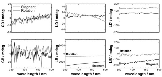 In Figure 2, it was noted that the intensity of the LB in the stagnant CLM cell was much larger than that of LB’, and the sign of LB was negative, so we can deduce that the slow axis of linear birefringence in the CLM cell directed along the curved wall of the CLM cell. Furthermore, the intensity of LB in the rotating CLM cell became smaller than that in the stagnant CLM cell. It is thought that the LB intensity might be due to the local distortion inside the glass wall of the cell and the heterogeneous value of the LB intensity might be averaged in the high speed rotation of the CLM cell. The decrease of LB intensity of the cell under the high speed rotation is advantageous for the CLM-CD measurement. Finally, it was found that although the linear birefringence of CLM cell varies from one cell to another and also depending on different cell areas, the CLM is appropriate to be used for the optical activity measurements.