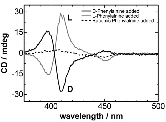 TPyP-CuTPPS hetero-aggregate including l-Phe also had chiral signal by the same reason. In Figure 5, the CD spectrum of TPyP-CuTPPS hetero-aggregates including d-Phe showed the opposite sign against that including l-Phe. CB spectra in Figure 5 were in the Kramers–Kronig consistency with the CD spectra. Thus, it was proved that the chirality of TPyP-CuTPPS hetero-aggregates at liquid-liquid interface could be correctly measured by 2-MGE. But, CD spectra measured by 2-MGE included larger noise than that measured by the commercial CD spectrometer.