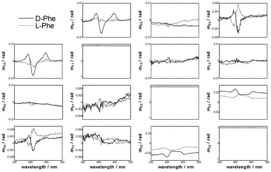 Detail of the experimental normalized Mueller matrices of TPyP-CuTPPS hetero-aggregates in the toluene-water system. [TPyP]org = 8 × 10−6 M, [CuTPPS]aq = 1.6 × 10−4 M, [Phe]aq = 9.6 × 10−3 M, [HClO4]aq + [NaClO4]aq = 0.1 M, pH 2.3, toluene:chloroform = 96:4, v/v, t = 30 min.