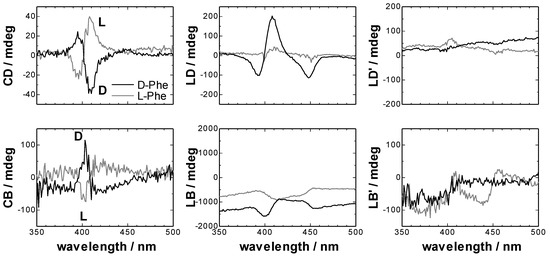 The units of CD, CB, LD, LB, LD’ and LB’ were converted from radian to milli-degree, because the commercial CD spectrometer usually use milli-degree as a unit of ellipticity. The converted spectra were shown in Figure 2.
