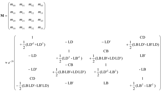 For thin specimens that show small mixed anisotropies and that CD and CB signals are smaller than LD and LB signals, we can ignore second-order terms in the chiral anisotropies as well as quadratic terms which involve both, linear and chiral anisotropies. In this case the general Mueller matrix of the sample reduces to the following equation [11]: