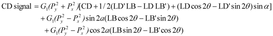 From the Stokes vector and the Mueller matrices formalisms, Kuroda et al. reported that CD signal measured by a conventional CD spectrometer such as Jasco CD polarimeter can be approximated as, [1,2]: