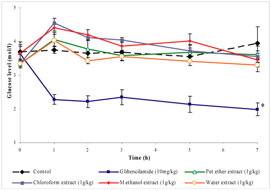 The effect of oral administration of petroleum ether, chloroform, methanol, and water extracts of O. stamineus leaves 1 g/kg (b.w.) on blood glucose levels of normal rats. The values are given as mean ± s.e.m (n = 6). * indicates a significant difference (P < 0.05) between the control and glibenclamide treated groups. (The treatments were given orally 1 h before time 0).