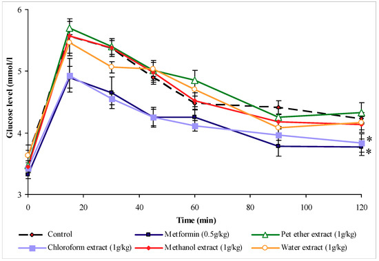 Figure 2 shows that treatment with petroleum ether, methanol, and water extracts did not significantly inhibit the rise in blood glucose levels of glucose-loaded rats. However, increases in blood glucose levels of chloroform extract- and metformin-treated rats were significantly inhibited (P < 0.05) after glucose loading, as compared to the control group.