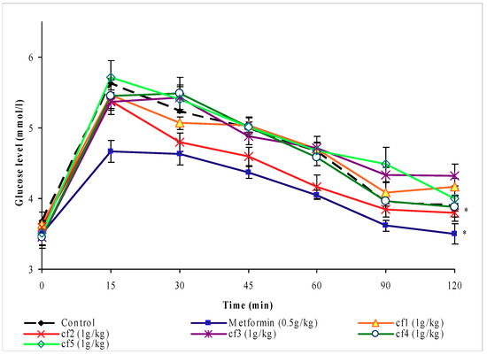 The effect of oral administration of chloroform fractions Cƒ1, Cƒ2, Cƒ3, Cƒ4 and Cƒ5 1 g/kg (b.w.) on blood glucose levels of normal rats loaded with glucose 150 mg/kg (b.w.) subcutaneously. The values are given as mean ± s.e.m (n = 6). * indicates a significant difference (P < 0.05) between the control group and metformin and fraction Cƒ2 treated groups. (The treatments were given orally 1 h before time 0 and glucose was loaded at time 0).