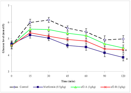 The effect of oral administration of sub-fractions Cƒ2-A and Cƒ2-B 1g/kg (b.w.) on blood glucose levels of normal rats loaded with glucose 150 mg/kg (b.w.) subcutaneously. The values are given as mean ± s.e.m (n = 6). * indicates a significant difference (P < 0.05) between the control group and metformin and sub-fraction Cƒ2-B treated groups. (The treatments were given orally 1 h before time 0 and glucose was loaded at time 0).