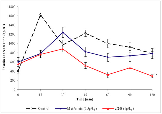 The effect of oral administration of sub-fraction Cƒ2-B 1 g/kg (b.w.) on plasma insulin levels of normal rats loaded with glucose 150 mg/kg (b.w.) subcutaneously. The values are given as mean ± s.e.m (n = 6). * indicates a significant difference (P < 0.05) between the control group and metformin and sub-fraction Cƒ2-B treated groups.