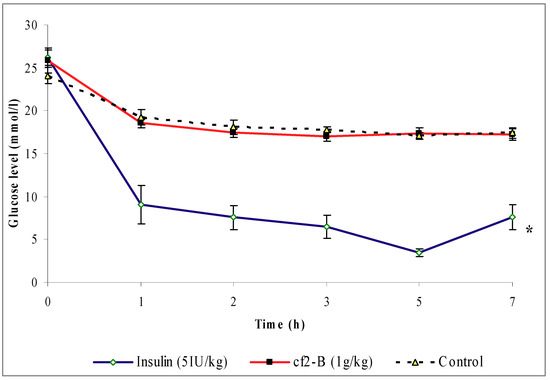 Oral treatment with 1 g/kg (b.w.) Cƒ2-B failed to reduce the blood glucose concentration to below control levels (Figure 6), and there was no significant difference (P < 0.05) in the blood glucose levels of Cƒ2-B treated and control group rats over the time course of the study. However, the blood glucose levels of the rats treated with insulin, 5 IU/kg (b.w.) were significantly reduced (P < 0.05).