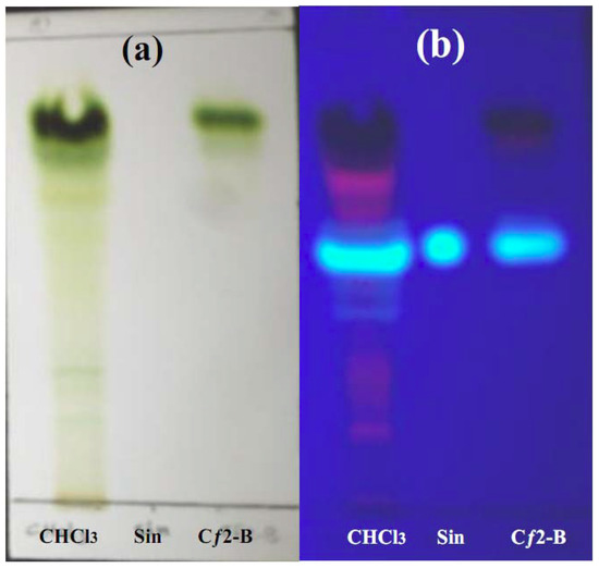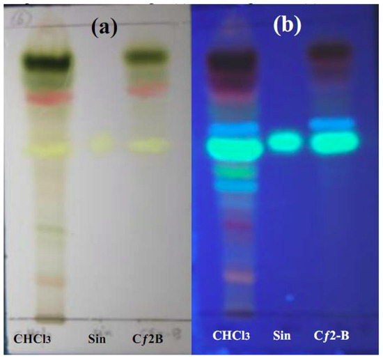 TLC profile of sub-fraction (Cƒ2-B), chloroform extract (CHCl3) and sinensitin (Sin) after being developed with ethyl acetate: chloroform (7.5:2.5) as mobile phase and sprayed with Antimony trichloride reagent under visible light (a) visible light and (b) UV 365 nm.
