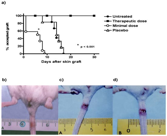 As expected, mice with skin allografts that did not receive any treatment rejected the transplanted skin 14 days after surgery, like the mice that received the placebo (Figure 1a). In contrast, mice that received treatment with minimal doses of CsA (CsA Low dose) significantly accelerated the rejection time of the allograft, reducing the time required for skin rejection by almost threefold from 14 days in untreated animals to 5 days in mice receiving minimal doses of CsA (Figure 1a and d). The animals treated with therapeutic doses of CsA did not reject the transplant during the 30 days of follow-up (Figure 1a). Figure 1b shows the tail of a mouse with an accepted skin allograft, whereas Figure 1c–d shows mice with skin allograft rejection, without treatment and treated with consecutive low dose of CsA, respectively.