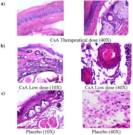 Control mice with transplants but no treatment showed some inflammatory necrosis and little infiltration of macrophages and neutrophils at day 14 after the graft (Figure 2a). In contrast, treatment with low doses of CsA induced a strong rejection reaction on the first days of treatment against the implanted dermis and epidermis, in which a severe neutrophil infiltration can be observed, with some macrophages. There were also some necrotic areas around a couple of arteries (Figure 2b, 40X) and in some muscle fibers. In contrast with all other groups, the graft-receiving host dermis showed intense macrophage and neutrophil phagocytic activity against muscular and nerve tissue, which may stimulate degenerative processes in the epidermis and glands. In contrast, allografts in mice that received a therapeutic treatment of CsA did not show the above-mentioned reactions (data not shown). In mice given therapeutic doses of CsA, images of a graft that was incorporated into host tissues showed a region of skin alongside the graft with intact sebaceous gland (data not shown and Figure 2b). The mice treated with the placebo formulation of therapeutic and minimal low doses of CsA solvents induced transplant rejection with characteristics similar to the control group with transplant and no treatment (placebo).