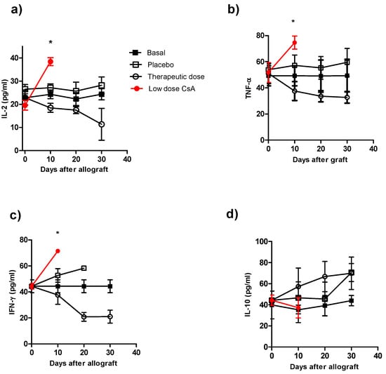 Kinetics of cytokine production during course of allograft in ICR mice receiving different treatment of CsA. Individual mice were bleeding at different times after skin allograft, and sera were processed for cytokine detection by ELISA a) IL-2 detection, b) TNF-α detection, c) IFN-γ detection and d) IL-10 detection in sera of from animals receiving allografts and CsA treatment. The data are the mean of two independent experiments at each time point. An asterisk indicates statistically significant (*P < 0.05) differences between the groups receiving CsA with respect to basal and placebo.
