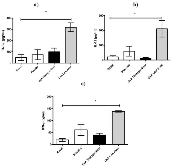 Effect of CsA on pro-inflammatory cytokine levels on sera early after rejection. (a–c) ICR mice, 6 mice per group, received placebo or 15 mg/kg of CsA (therapeutic dose) or 5 × 10−55 mg/kg of CsA (low dose) daily since the time of skin transplantation. Seven days later cytokines (TNF-α, IFN-γ and IL-12) were analyzed by ELISA.
