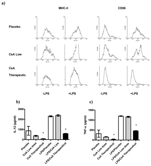Recently it has been demonstrated that other cell types besides T cells can be affected by CsA [21,22,23]. In order to know whether or not other important regulatory cells were affected by the low doses of CsA treatment we analyzed whether exposure of DCs to therapeutic or low doses of CsA in vitro may alter the pro-inflammatory response and maturation markers of those cells to LPS-mediated stimuli. The maturation markers (MHC-II and CD86) as well as the production of IL-12, and TNF-α two key cytokines associated with inflammatory responses, were assayed. We detected that DCs exposed to therapeutic dose of CsA inhibited the expression of the maturation markers MHC-II and CD86 (Figure 6a), in contrast, DCs exposed to low dose of CsA displayed a typical maturation, similar to that obtained with placebo (Figure 6a). In line with these observations, exposure of DCs to placebo or CsA low dose for 24 h did not induce significant secretion of IL-12 or TNF-α compared with unstimulated DCs (Figure 6b–c). In contrast, DCs exposure to therapeutic CsA dose showed lower levels of these two inflammatory cytokines (Figure 6b–c). As expected, we found that BMDCs stimulated with LPS (1 μg/mL), induced high production of the pro-inflammatory cytokines IL-12 and TNF-α (Figure 6b–c). We then analyzed whether acute exposure of DCs to different doses of CsA may influence the response to LPS-mediated stimuli. BMDCs were exposed to CsA and immediately stimulated with LPS for 24 h. Exposure to therapeutic dose of CsA down-regulated the production of both pro-inflammatory cytokines tested (Figure 6b–c). Interestingly, CsA in low dose did not alter the production of both IL-12 and TNF-α (Figure 6b–c).