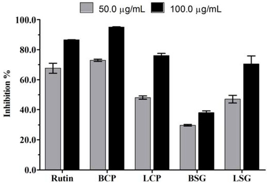 Differences were observed in the radical scavenging activity both between the different species and between the different parts of the same species (Table 2). Of the samples tested, the CEE of the bark of C. pyramidalis presented the lowest concentration of extract needed to reduce free radicals by 50% (IC50 = 16.98 ± 1.34 µg/mL), and this value was statistically higher than rutin. Although the CEE of the bark of C. pyramidalis was more efficient in removing free radicals than the CEE of the leaves, the CEE of S. glandulosum leaves was more efficient than the CEE of the bark. The assessment of the percentage of antioxidant activity at 100 µg/mL showed that the CEE of the bark of C. pyramidalis was statistically higher than rutin at the same concentrations (Figure 1).